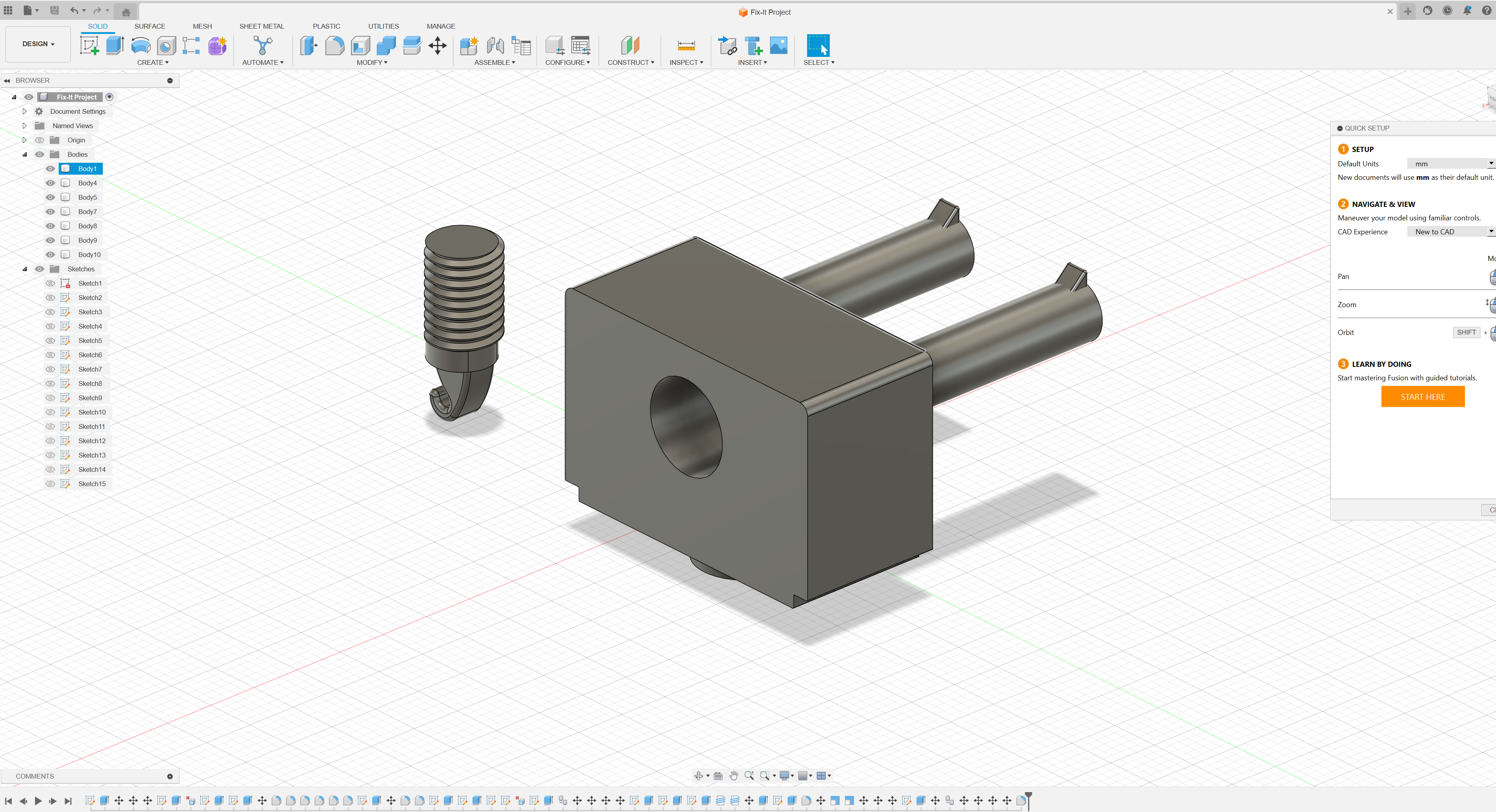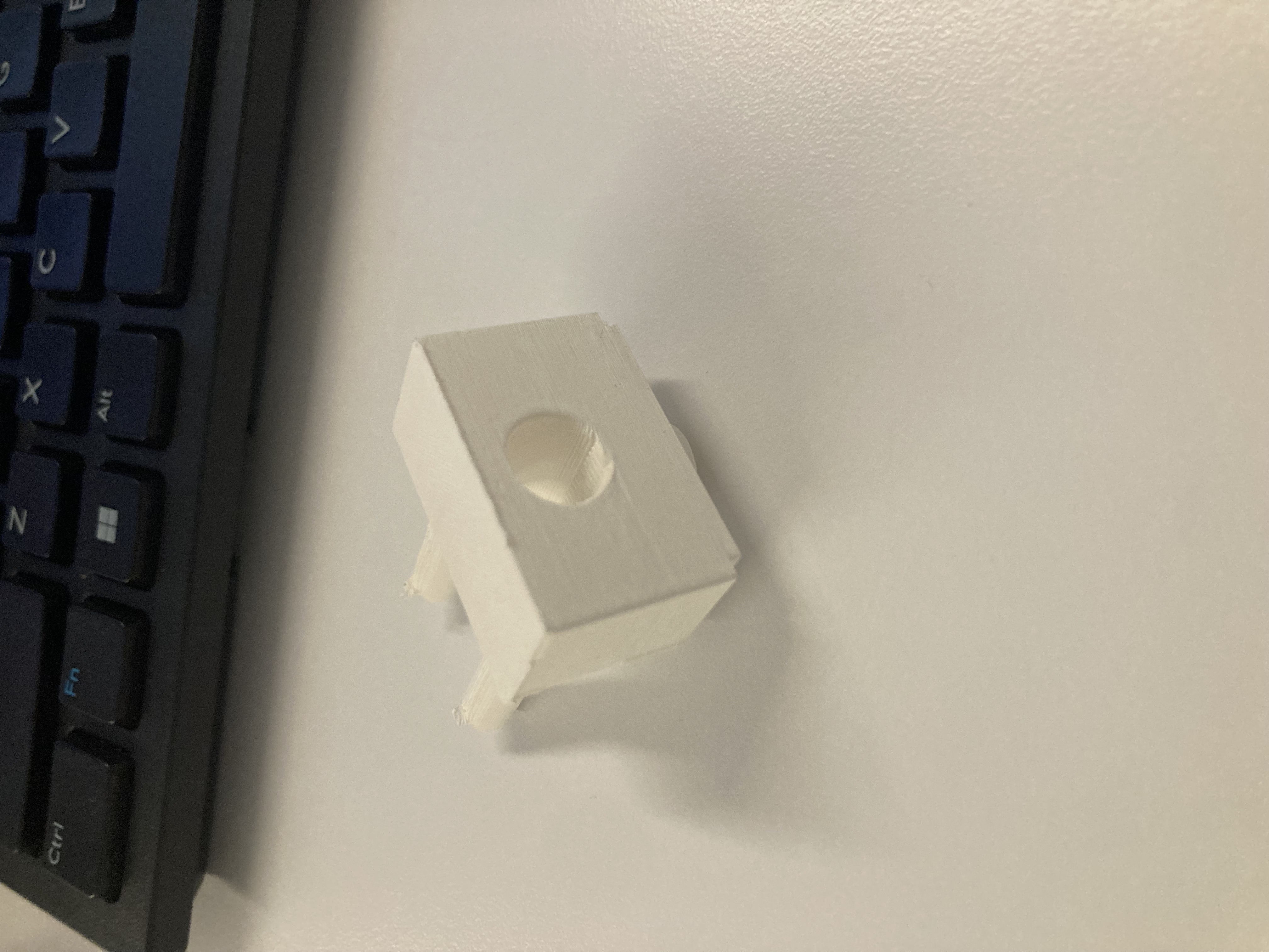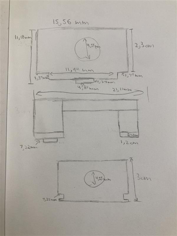 Here, I made a sketch for my wand control for the blinds. I also made rough measurements of the wand control so I can know what dimensions my object needs to be. Here is my full model. I started off by sketching a rectangle and punched 2 holes to it. The first hole is larger and it is meant to fit into the rod while the smaller hole is located at the bottom and it is meant for the hook. I then attached 2 cylinders at the back so it can attach to the blinds to slide forward and/or backwards. Here is my final product. The dimensions for the main body is okay but I made a lot of measurement errors. First of all, the 2 cylinders do not fit into the the 2 holes of the first blinds since they were too large and that the gap between them are off by a few milimeters. Second of all, the hook meant for the smaller hole does not fit. I made the threads too big. Lastly, the hook for the wand is just too small. The sketch I drew for the hook seems normal when I am in Fusion but when it was done printing, it is extremely small.